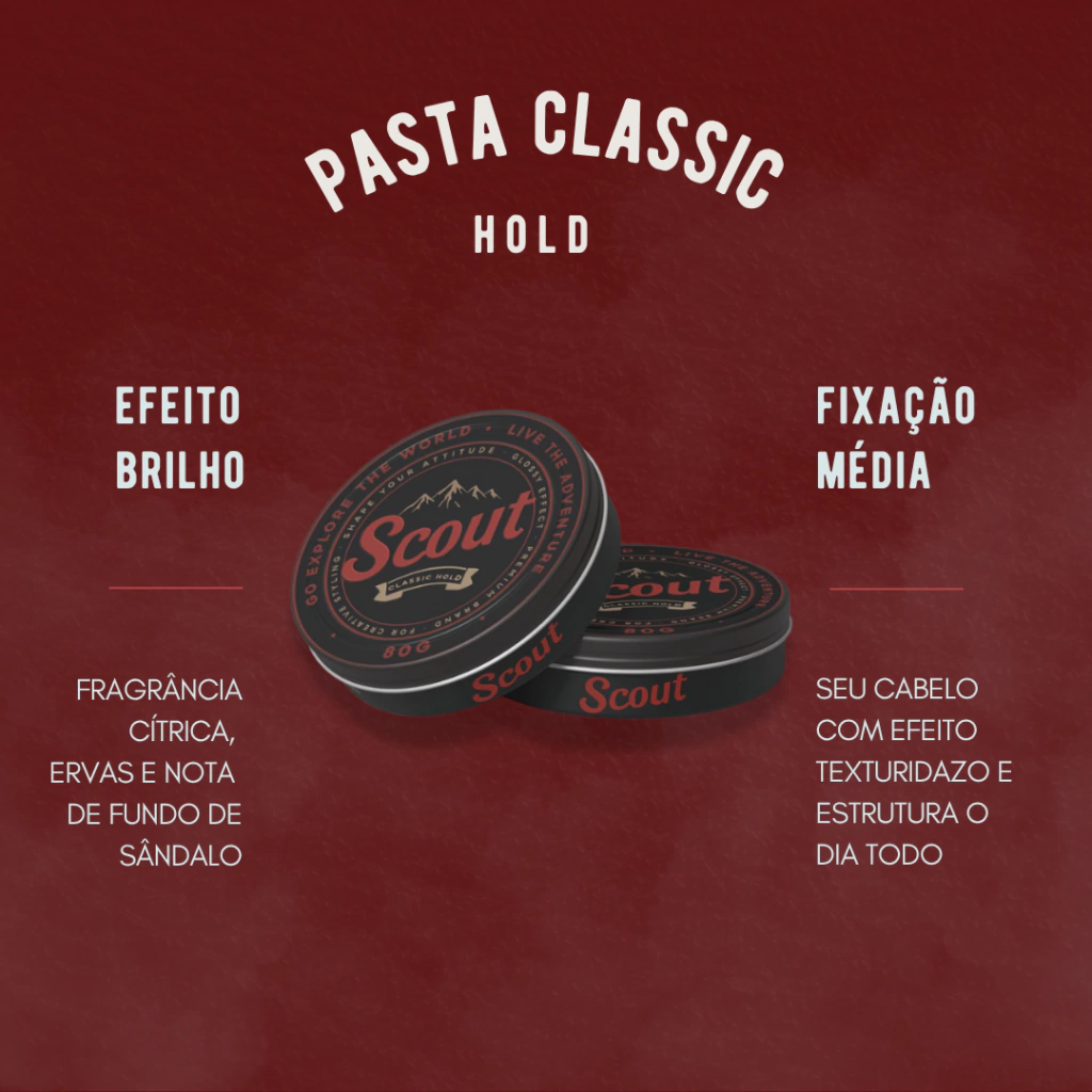 Este produto é para quem busca fixação forte, mas flexível com brilho perfeito. Com fragrância mentholada. A Pasta Classic Hold é feita a base d’agua (sai fácil em única lavagem), que permite fácil aplicação sobre os fios deixando um efeito texturizado possibilitando penteados versáteis, com visual “certinho”, alinhado e comportado. Sua fórmula não é oleosa, e proporciona hidratação aos fios o dia todo.